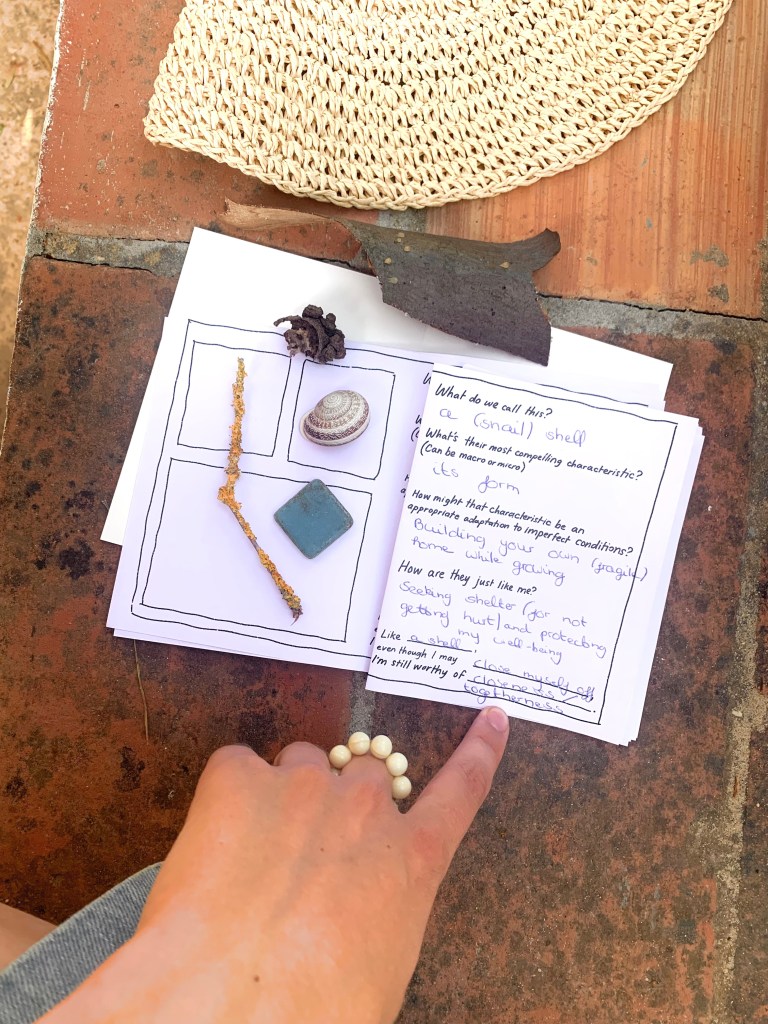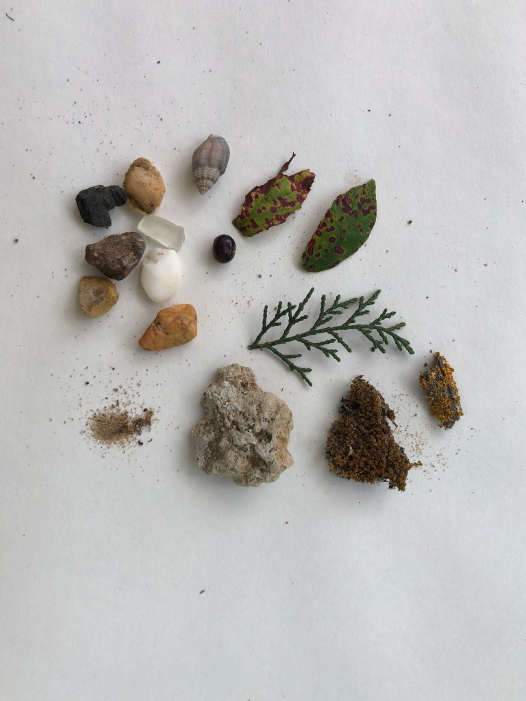 Participants receive a simple workbook of prompts guiding them through an outdoor environment (shoreline, paths, liminal outdoor spaces) with attention to textures, patterns, sounds, colors, and subtle details. Rather than directing participants toward predetermined outcomes, the prompts create space for individual curiosity and personal response.